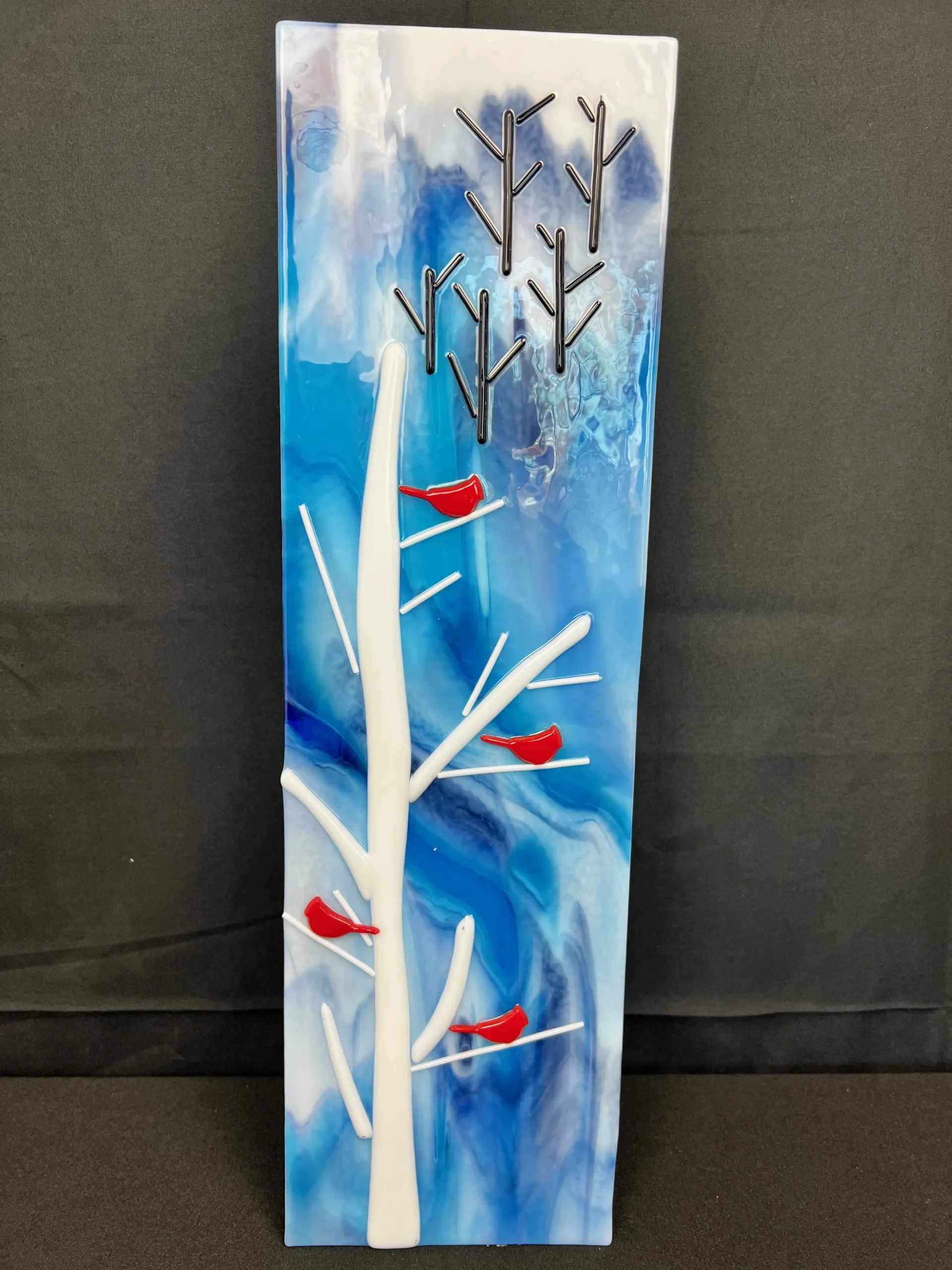 This stand-alone art glass piece has a white winter tree on a blue background. It stands beautifully against a wall.
