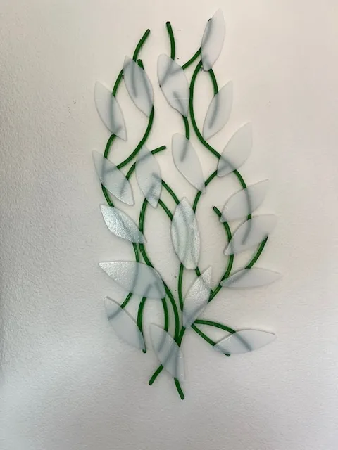 This glass art wall sculpture is made with light green rods and individually fused on leaves. It is very easy to hang on two white nails.